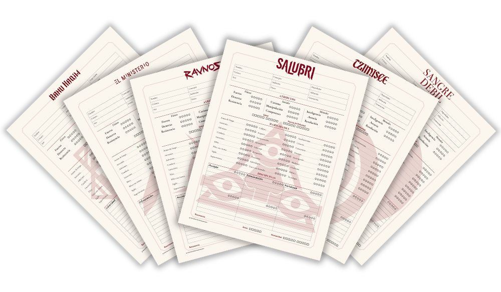 Estas nuevas hojas de personaje incluye a los Clanes que han ido apareciendo en los suplementos publicados hasta el momento en español para la línea de Vampiro: La Mascarada 5ª edición: Banu Haqim (Camarilla), El Ministerio (Anarquistas) y Ravnos, Salubri y Tzimisce (V5 Companion); también hemos actualizado la hoja de personaje de los Sangre Débil para incluir su nuevo símbolo.